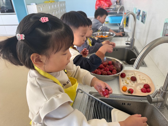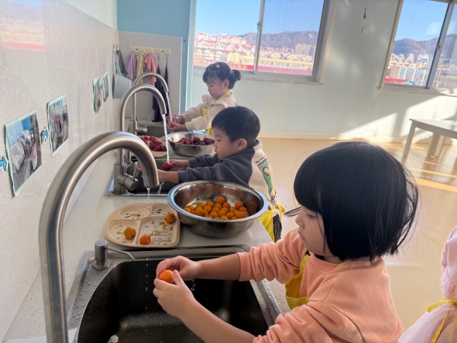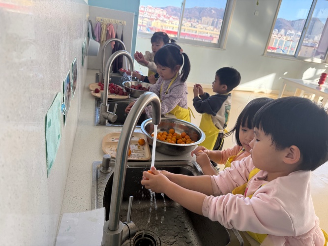 孩子们围在水池边,小手轻轻搓洗着红艳艳的小柿子、金灿灿的橘子。他们认真观察着水的流动,感受着水果的质地,