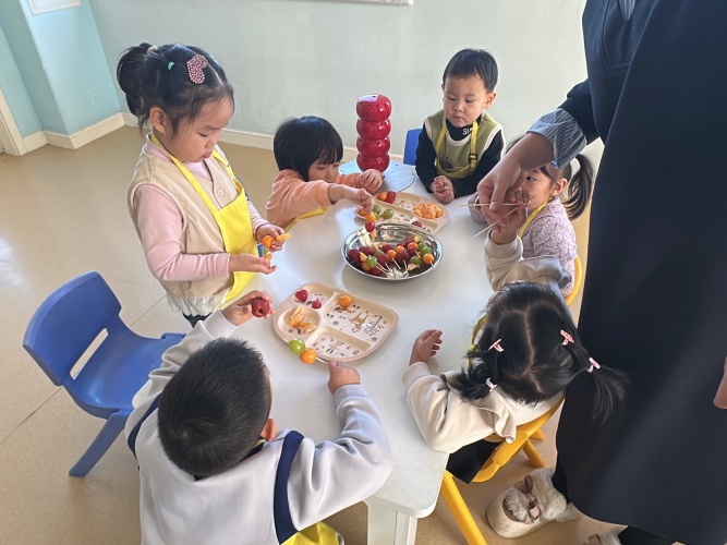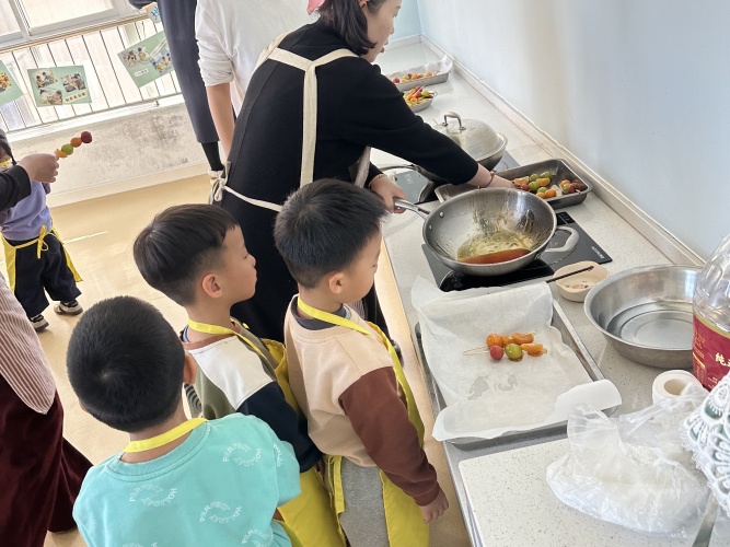 在老师的帮助下,每串水果轻轻浸入糖浆,再举起时,已经披上了一层晶莹剔透的“水晶外衣”。孩子们看着这
