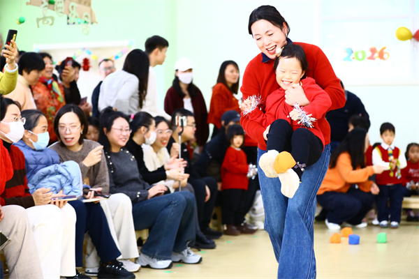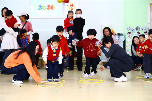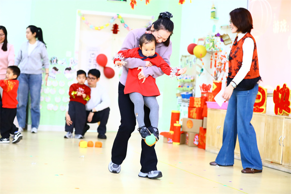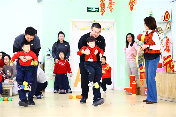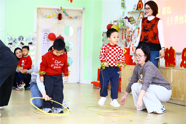 《小青蛙跳荷叶》《萌娃运沙包》等亲子游戏让大朋友们也找回了童真的乐趣。