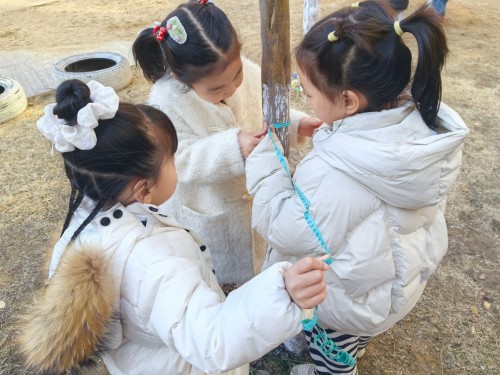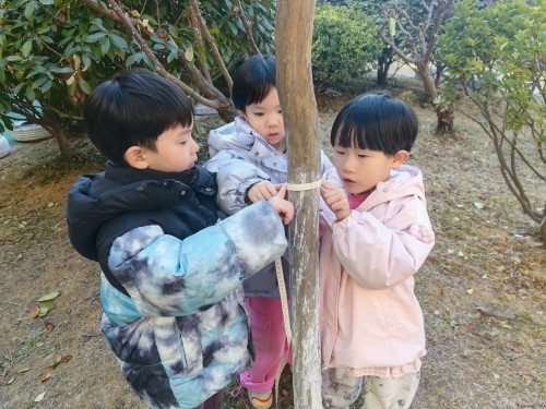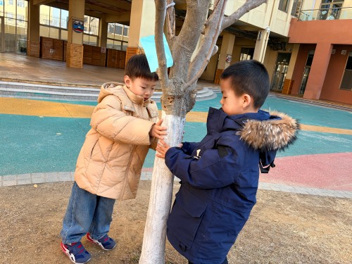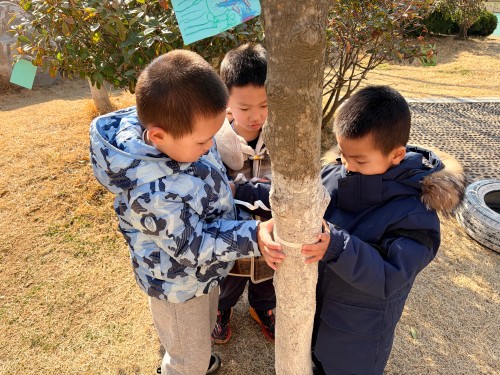 我们准备了软尺、毛线,有的小伙伴还用小手紧紧抱住树干,有的用小手比一比,认真地量一量小树有多粗。