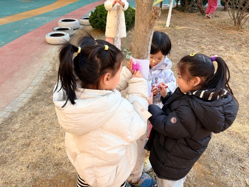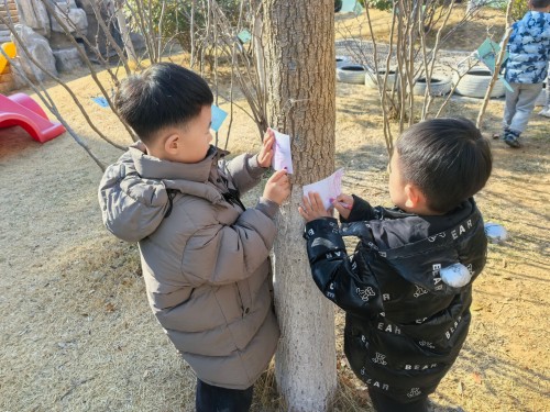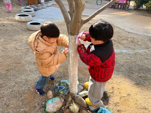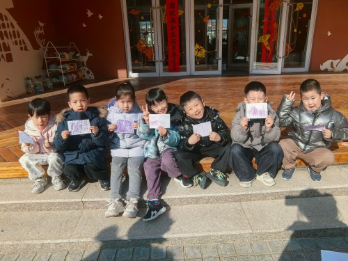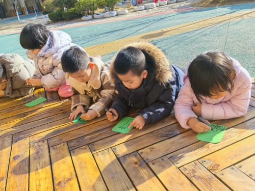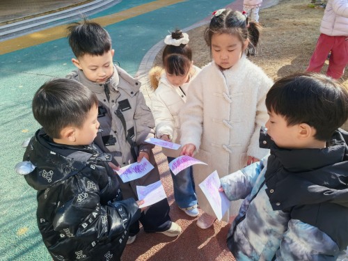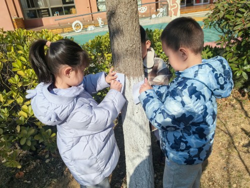 我们还把画纸轻轻贴在树干上,握着油画棒慢慢涂呀涂,神奇的事情发生啦!树干上粗糙的纹路、独特的图案,全都印在了纸上。每一幅拓印作品都不一样,就像每一棵小树都有自己的小秘密,我们捧着自己的作品,越看越喜欢~